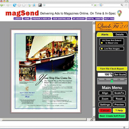 Without purchasing any additional hardware or software, magSend takes your creative ad design and, with your participation and approval, turns it into fully compliant, final electronic print-ready production material, then delivers it directly to your magazine without time consuming delay cycles, or overnight express delivery charges.